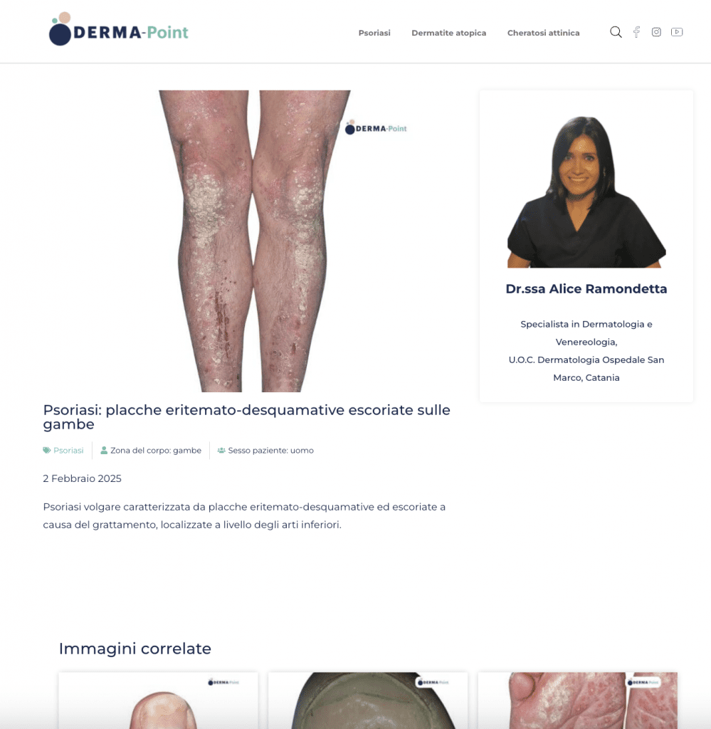 Ogni Report ha poi una pagina dedicata (es: https://www.derma-point.it/img/psoriasi-placche-eritemato-desquamative-escoriate-sulle-gambe/) con informazioni ed elementi correlati alla stessa: